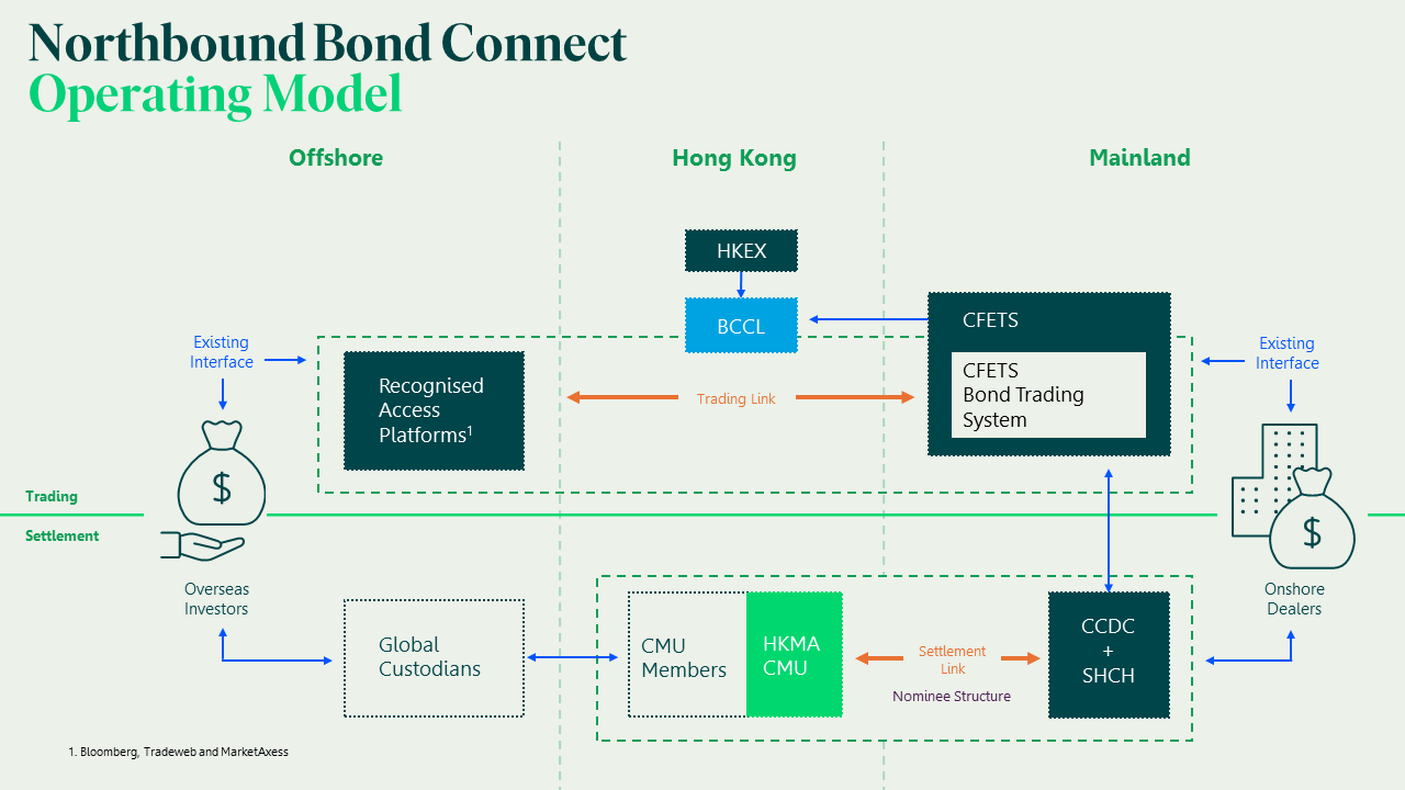Northbound Bond Connect allows offshore investors to participate directly in China's onshore bond market. Under this scheme, the CMU has streamlined and shortened the investor application process, adopting a nominee account structure. This enables offshore investors to settle and hold CIBM bonds through the CMU using existing practices and continue trading via offshore trading platforms currently in use, bringing global investment full circle.