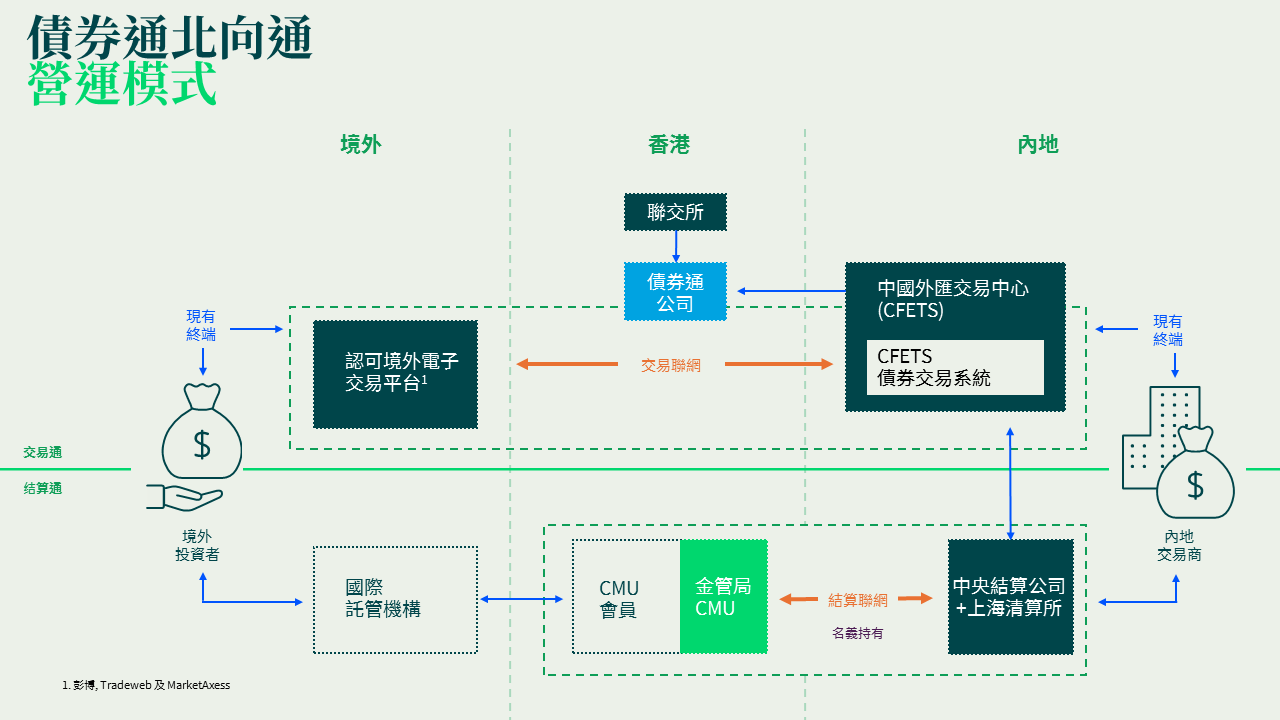 - 提升營運效率:CMU為債券通投資者提供自動化後台運作及業務報告服務,加速資金及資訊流動,形成高效率的運作環,協助投資者從容應對全球債券市場。